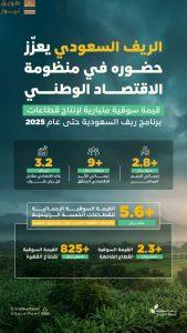 كشف برنامج التنمية الريفية الزراعية المستدامة “ريف السعودية“، عن وصول القيمة السوقية الإجمالية لقطاعات البرنامج الرئيسية، إلى أكثر من 5.6 مليارات ريال حتى عام 2025م؛