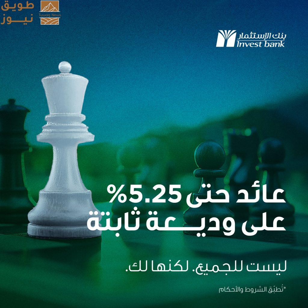 أعلن بنك الإستثمار عن إطلاق عرض الوديعة الثابتة الجديد بعوائد تنافسية ومضمونة تبلغ 4.65% لسنة واحدة و5.25% لسنتين. عرض حصري ومحدود، صُمم خصيصاً لمن يدركون قيمة القرارات المالية الذكية، ويسعون إلى تحقيق الاستقرار والنمو بعيداً عن تقلبات الأسواق.
