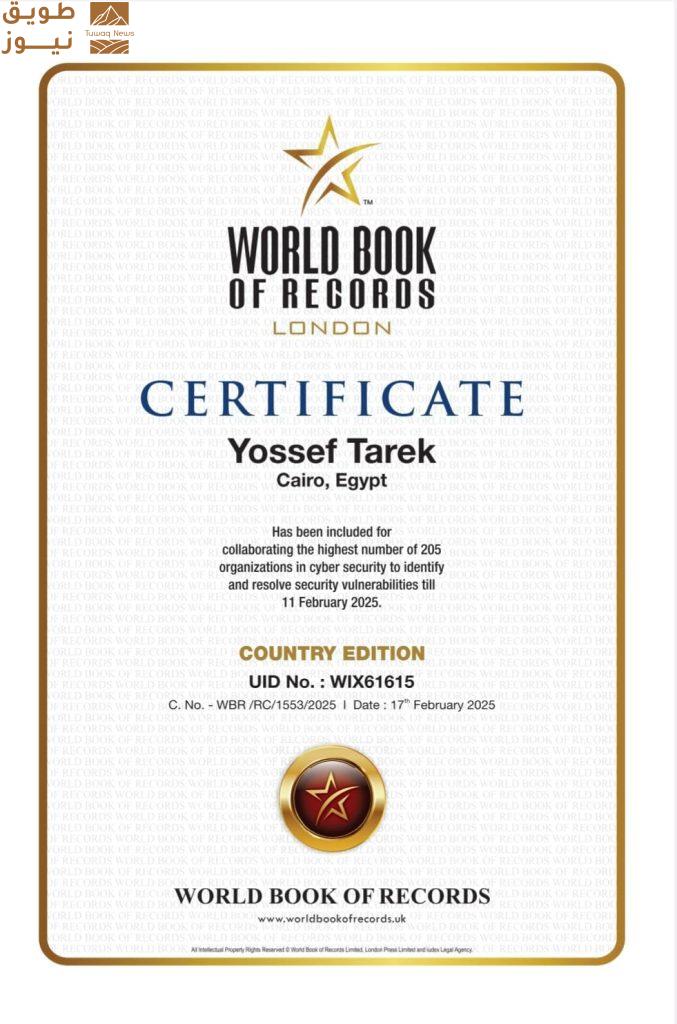 في إنجاز مصري غير مسبوق، سجل الشاب المصري «يوسف طارق»، رقمًا قياسيًا عالميًا في الكتاب العالمي للأرقام القياسية (World Book of Records) كأكثر متخصص في الأمن السيبراني تعاونًا مع منظمات وشركات حول العالم لتحديد الثغرات الأمنية وإصلاحها. بلغ عدد الشركات التي تعاون معها 205 شركة، مما يعكس تأثيره الكبير في تعزيز أمن المعلومات على مستوى عالمي.