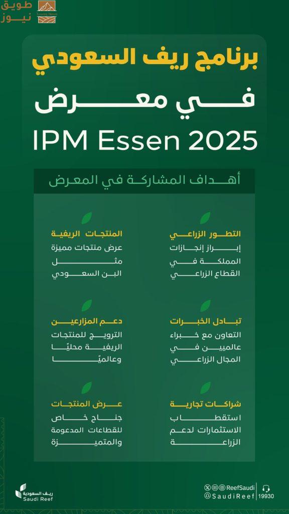 تشارك المملكة العربية السعودية، ممثلة في برنامج التنمية الريفية الزراعية المستدامة “ريف السعودية”، في معرض IPM Essen 2025)) الذي تستضيفه مدينة أيسن الألمانية، خلال الفترة من 28 إلى 31 يناير الجاري؛ لتعزيز مكانتها الرائدة عالميًا في دعم وتطوير القطاع الزراعي، مع التركيز على دعم صغار المزارعين، والترويج للمنتجات الريفية في الأسواق الدولية.