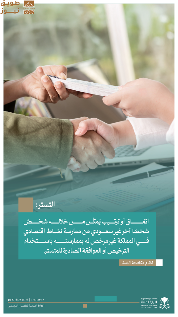 وأوضحت النيابة العامة أن التستر هو اتفاق أو ترتيب يُمكن من خلاله شخصٌ شخصاً أخر غير سعودي من ممارسة نشاط اقتصادي في المملكة غير مرخص له بممارسته باستخدام الترخيص أو الموافقة الصادرة للمتستر.