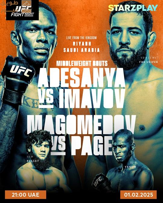 ويتنافس في البطاقة الرئيسية لاعب الفنون القتالية المختلطة الشهير إسرائيل أديسانيا، الذي يتطلع إلى استعادة لقبه كبطل للوزن المتوسط بعد خسارته الأخيرة، ضد نصر الدين إيمافوف، الذي يدخل النزال بثلاثة انتصارات متتالية. ومن المتوقع أن تشهد هذه المباراة المرتقبة أحداثاً مثيرة ستحدد المرحلة التالية في فئة الوزن المتوسط.