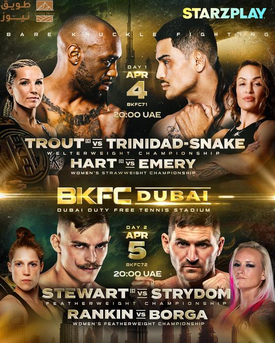 ويتواصل الحماس حتى يوم السبت، حيث يدافع “الملك” كاي ستيوارت عن لقبه في بطولة العالم لوزن الريشة ضمن منافسات القتال بالأيدي العارية BKFC للمرة الرابعة ضد منافسه الجنوب إفريقي تومي ستريدوم، الذي لم يسبق أن واجه أي خسارة. ويتطلع ستيوارت، النجم الشهير في BKFC، إلى مواصلة هيمنته على الألقاب البطولية، بينما يسعى ستريدوم، الذي يتميز بأسلوبه الهادئ وعزيمته القوية، لإطاحة البطل وانتزاع لقبه الأول ضمن بطولة القتال بالأيدي العارية .
