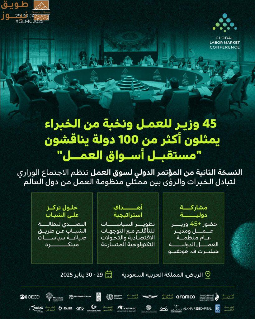 تستضيف الرياض، يوم الأربعاء الموافق 29 يناير 2025، الاجتماع الوزاري الدولي الخاص بالنسخة الثانية من المؤتمر الدولي لسوق العمل الذي يأتي برعاية كريمة من خادم الحرمين الشريفين الملك سلمان بن عبدالعزيز آل سعود -حفظه الله-،